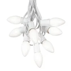 Buy Novelty Lights blue C9 string light set with black wire that is 100 feet long and will make your holiday decorating easy, bright and beautiful. Each set includes 125 C9 bulbs and a black wire stringer with 100 sockets that are spaced 12″ apart. These blue C9 Christmas light sets have long lasting 3000 hour bulbs and are on a 18 gauge black wire. All our C9 light strings use patented Admiral Brand sockets. These durable and heavy duty light strings will provide you with years of maintenance free use. Each Set includes 25 replacement bulbs.