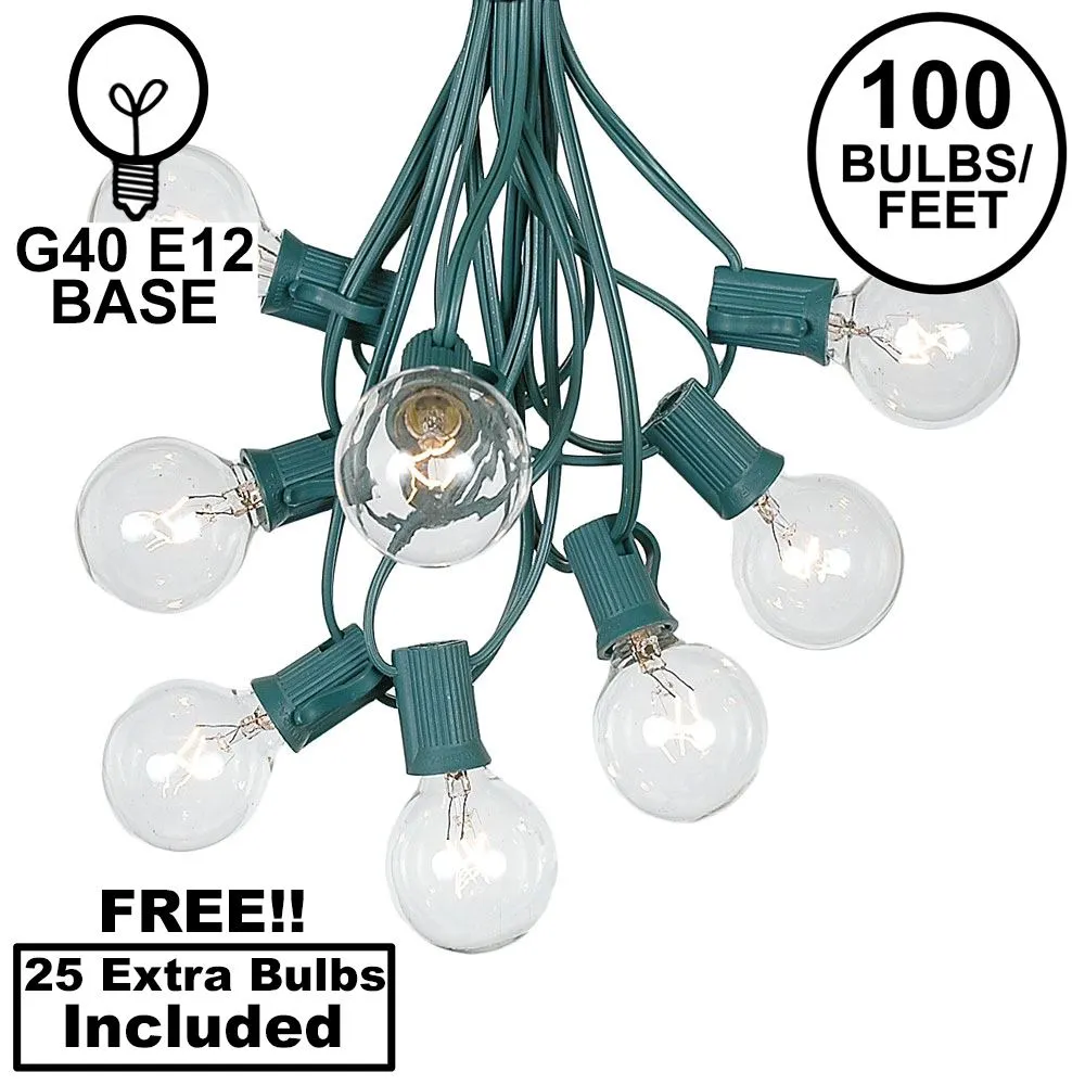 Novelty Lights 100 foot Clear G40 globe string light sets are perfect to illuminate your outdoor garden, patio, deck, yard, or special event space. Each set includes 125 round Clear G40 globe bulbs and a Green 100 foot heavy-duty wire stringer with 100 sockets that are spaced 12″ apart. Our Clear G40 globe string light sets have long lasting 3000 hour bulbs and are on a durable 20 gauge Green wire. All of our G40 light strings use patented Admiral Brand sockets, and come with 25 extra bulbs for life’s little mishaps. These durable and heavy duty light strings will provide you with years of maintenance-free use.