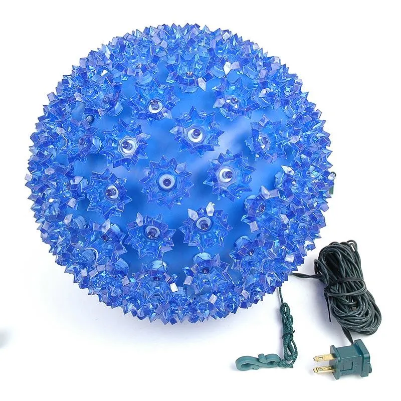 Buy a 150 light blue LED starlight sphere for both indoor and outdoor use. These durable and energy efficient blue LED light balls have the same high quality wide angle LED’s that we offer in our commercial grade LED mini lights. These 10 inch 150 light blue LED starlight spheres have a stackable male plug for powering additional spheres and a 12′ lead cord. Mix and match colors and sizes to create unique and energy efficient outdoor light displays this holiday season and for many seasons to come!
