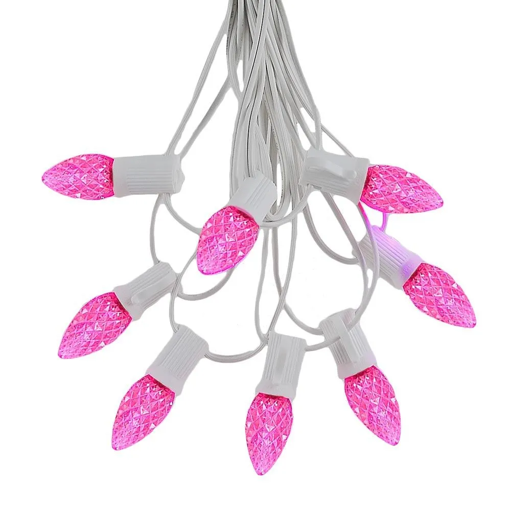 Novelty Lights Pink LED C7 string light set with 25 bulbs, perfect for outdoor patios, decks, special events or Christmas lighting. Each set includes 25 bulbs on a White wire stringer with 25 sockets that are spaced 12″ apart. Each Pink C7 Christmas light is on an E12 candelabra base and has 2 ultra bright SMD LED chips. Each bulb only consumes 0.80 watts (0.0067 Amps) per bulb, compared to traditional incandescent C7 bulbs that use 5 watts. Our Pink C7 LED Christmas light bulbs are housed in a hard multifaceted plastic bulb that will not fade, chip or crack. With a 3 season warranty, these LED Christmas light sets offer great energy savings and durability for an excellent value. All our C7 light strings use patented Admiral Brand sockets. Our durable and heavy duty LED C7 light strings will provide you with years of maintenance free use.