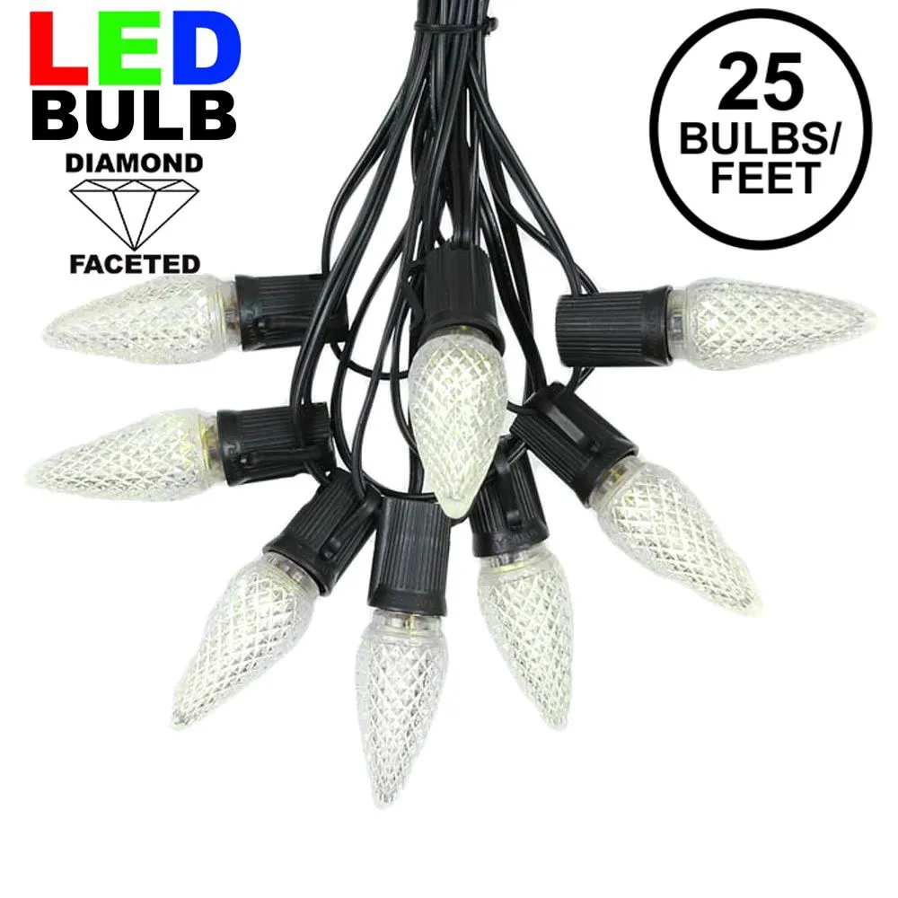 Novelty Lights Warm White LED C9 string light set comes with 25 bulbs and is perfect for outdoor patios, decks, special event or Christmas lighting. Each set includes 25 bulbs on a black wire stringer with 25 sockets that are spaced 12″ apart. Each Warm White C9 Christmas light bulb has an E17 intermediate base and 2 ultra bright SMD LED chips. Each bulb only consumes 0.80 watts (0.0067 Amps) per bulb, compared to traditional incandescent C9 bulbs that use 7 watts. These Warm White LED bulbs are designed to give off a soft white/yellow glow, similar to their incandescent counter parts. These warm white C9 LED Christmas light bulbs are also housed in a hard multifaceted plastic bulb that will not fade, chip or crack. With a 3 season warranty, these LED Christmas light sets offer great energy savings and durability for an excellent value. All our C9 light strings use patented Admiral Brand sockets. Novelty Lights durable and heavy duty LED C9 light strings will provide you with years of bright and beautiful maintenance free use.