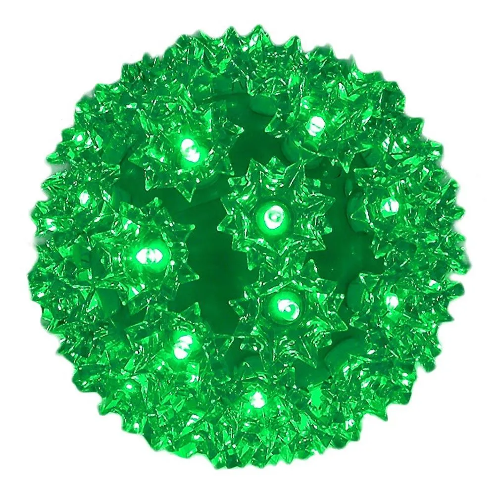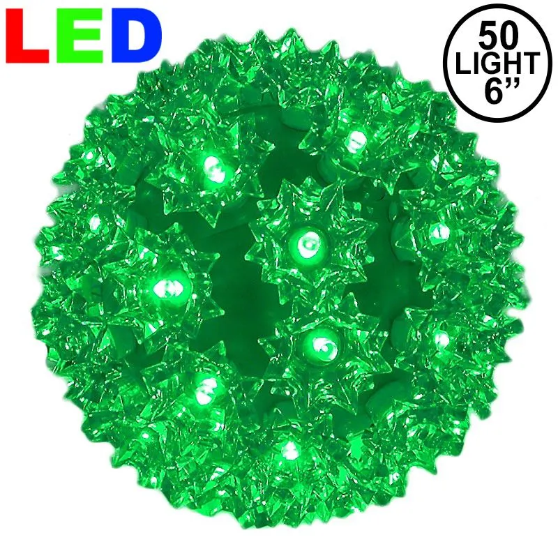 Buy a 50 light green LED starlight sphere for both indoor and outdoor use. These durable and energy efficient green LED light balls have the same high quality wide angle LED’s that we offer in our commercial grade LED mini lights. These 6 inch 50 light green LED starlight spheres have a stackable male plug for powering additional spheres and a 12′ lead cord. Mix and match colors and sizes to create unique and energy efficient outdoor light displays this holiday season and for many seasons to come!