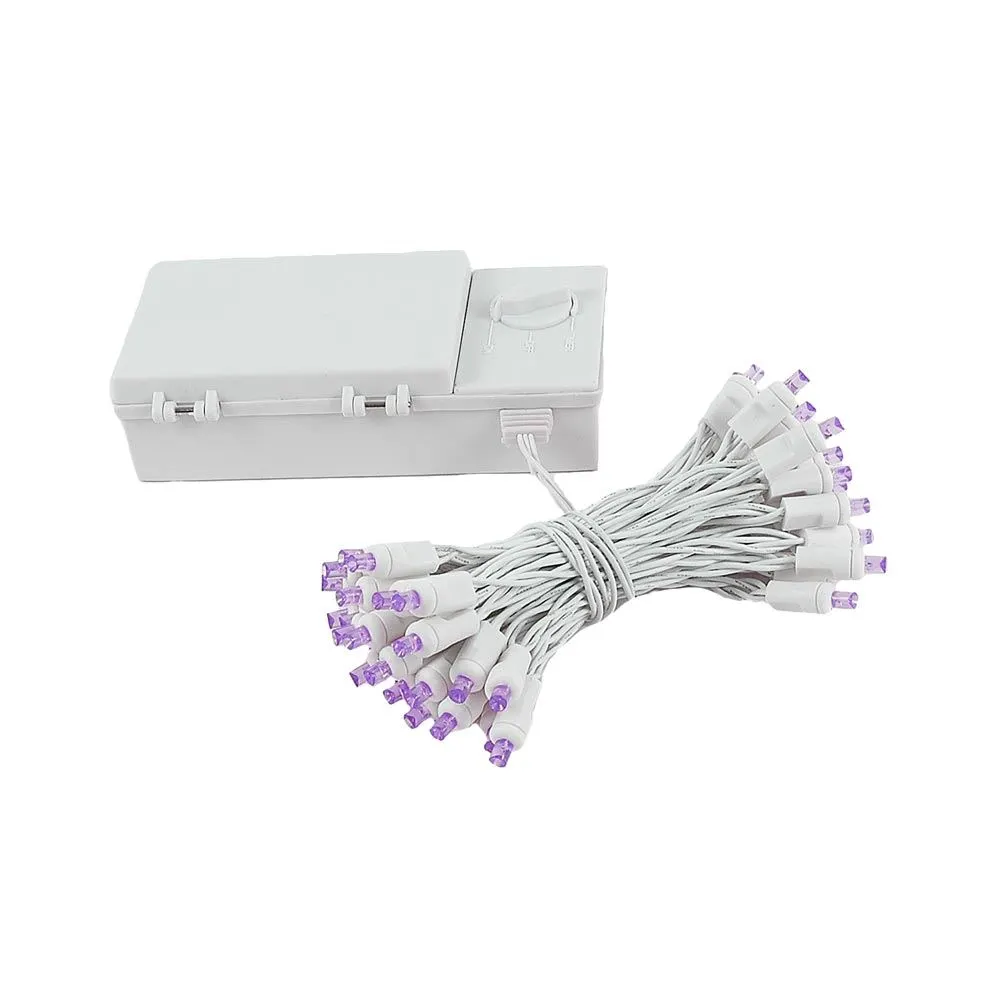 50 LED Purple Battery powered Christmas light string for holiday and special event lighting when there is no power supply. These super bright battery operated LED lights have 50 wide angle purple lights that run on 3 D batteries(not included). Our 50 LED battery operated lights are built to last using a weatherproof battery case with clamps making these units perfect for outdoor use. Each unit also comes with an optional timer function. Simply turn the timer on when you want the lights to come on. Once the timer is set the lights will come on at the same time every day and stay on for 6 hours lasting up to 2 weeks on a good set of batteries. Ideal for decorating where power is unavailable or simply getting rid of the extension cords.