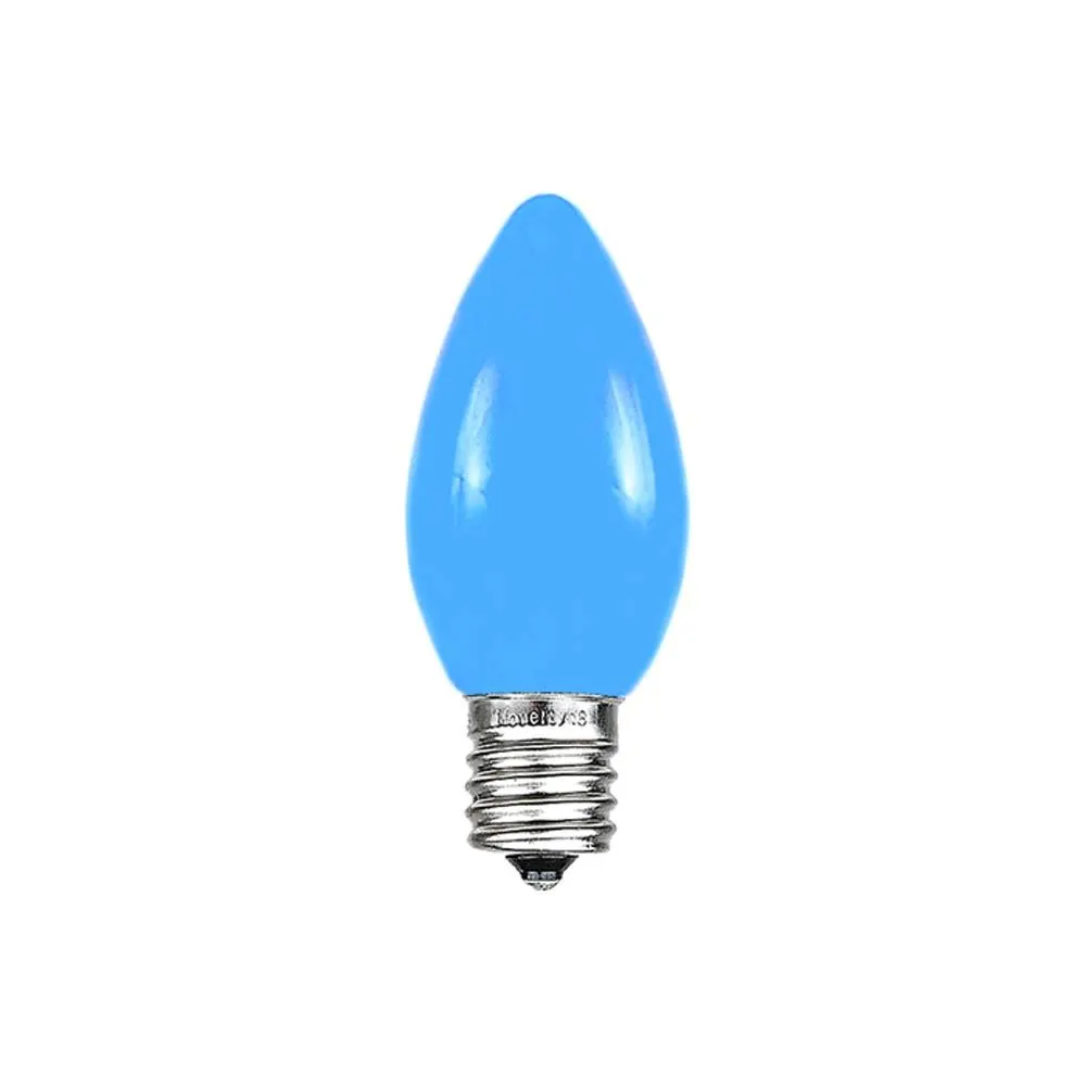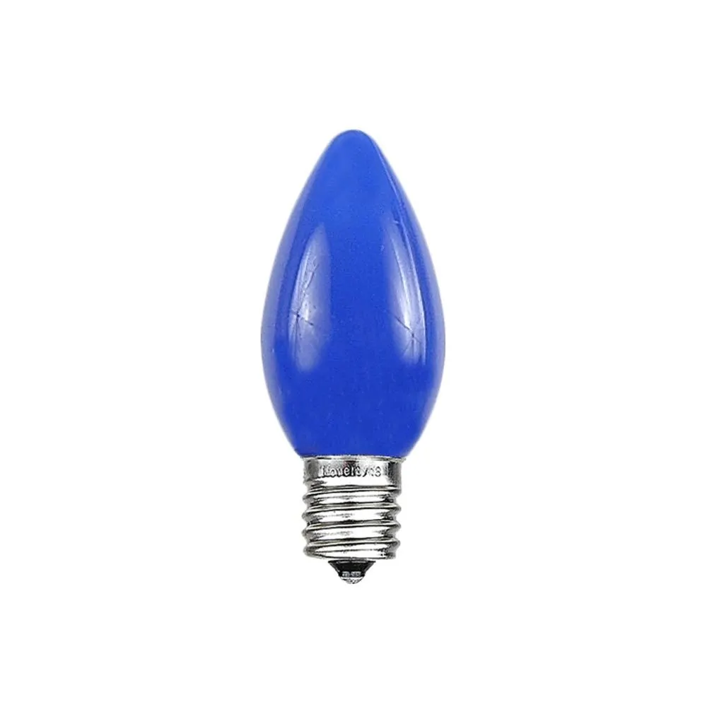 Novelty Lights Blue Colored C7 LED Smooth Ceramic Bulbs (plastic), have the traditional look of our popular incandescent ceramic bulbs, but are 90% more energy efficient! These LED ceramic plastic bulbs will save you money on energy costs, but you can still enjoy the same vintage look of a painted ceramic bulb. Unlike their incandescent counter-parts, these bulbs will not get hot, giving you more options for indoor and outdoor applications, and they are plastic so they won’t break! Lasting 40,000 hours, these vintage Blue colored bulbs will provide years of beautiful holiday illumination for your Christmas tree, roofline display, or outdoor Christmas light display. Use these antique style, yet energy efficient bulbs with our C7 Stringers (10’, 12.5’, 25′ & 100′), our E12 Heavy Duty Light Strings (25′, 100′ & 330′), our commercial grade bulk C7 Bulk spools as well as our vintage Twisted Wire Strings with E12 Bakelite Sockets. Each bulb utilizes 2 Ultra-Bright SMD LED Technology, does not produce heat.