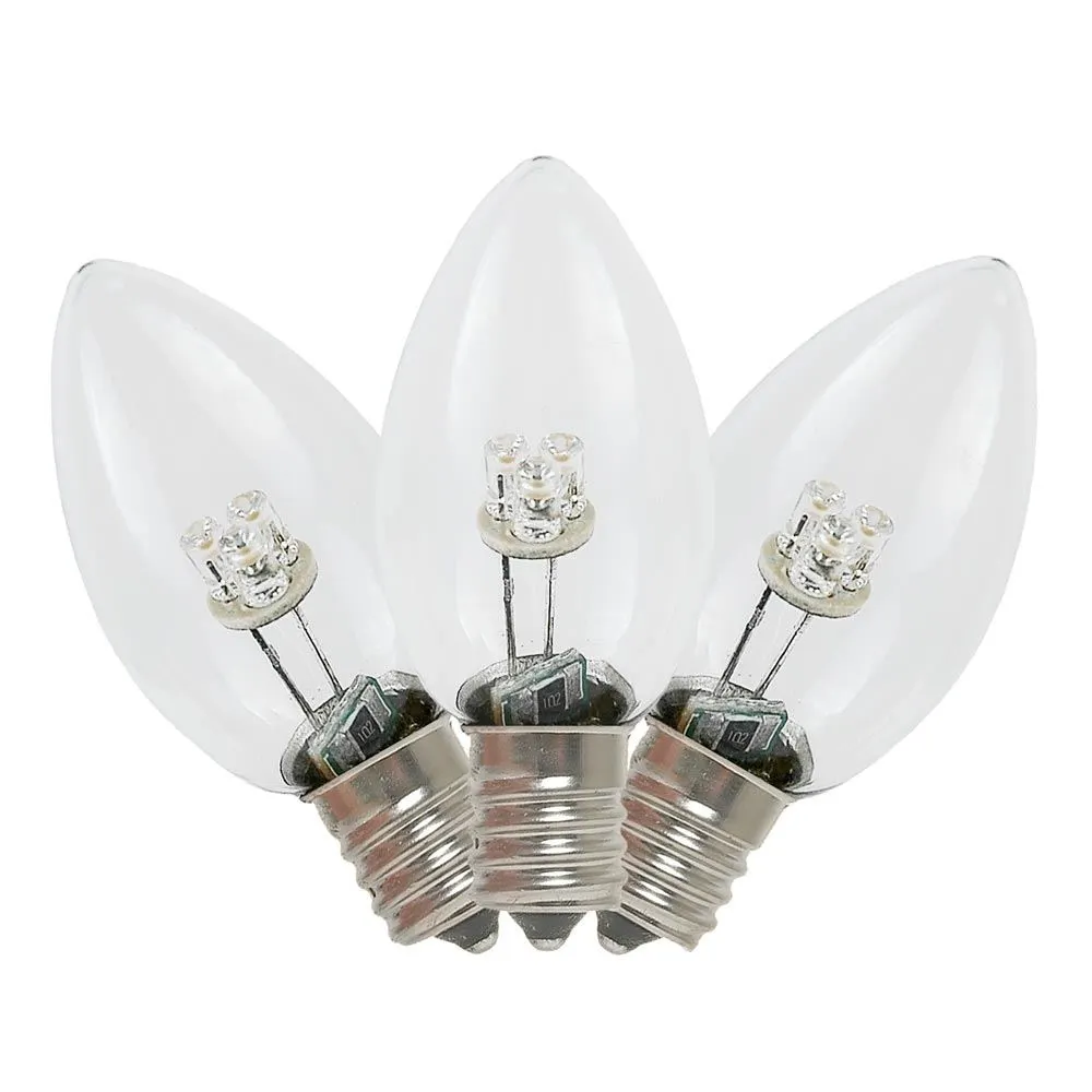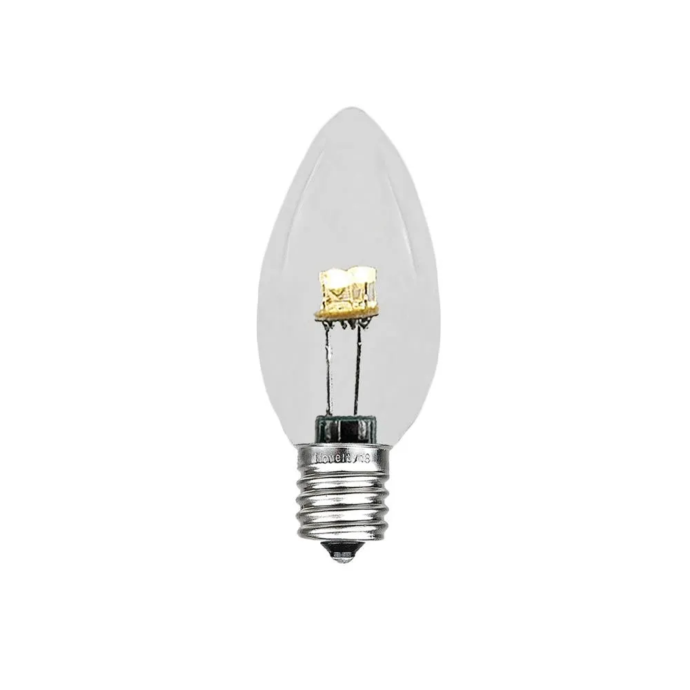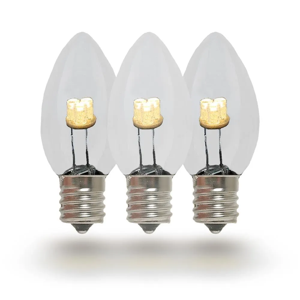 Novelty Lights beautiful, energy-efficient glass LED Warm White C7 bulbs for long-lasting, vibrant, Christmas light displays. Our glass LED bulbs are as versatile as they are stunning; use them as outdoor string lights or party lights in the summer and as Christmas tree lights, roofline bulbs and outdoor Christmas light displays in the winter. The smooth glass material of these bulbs is reminiscent of traditional incandescent Christmas lights and gives them an antique look. Our Warm White energy efficient bulbs use 1/10 the energy of their incandescent counterparts, yet they are just as bright; each bulb has 3 vibrant diodes, does not produce heat, and is vibration resistant. If you are using C7 LED bulbs for the first time or if you are retrofitting your old C7 strings, our glass LED C7 Warm White Christmas lights are the stunning, smart, green, and energy-efficient solution. Our C7 glass LED bulbs can be used with our C7 Stringers (10’, 12.5’, 25′ & 100′), our E12 Heavy Duty Light Strings (25′, 100′ & 330′), our commercial grade bulk C7 Bulk spools as well as our vintage Twisted Wire Strings with E12 Bakelite Sockets.