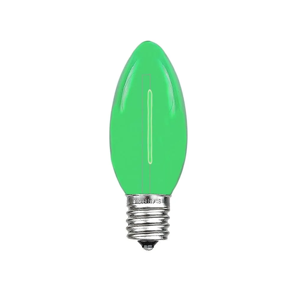 Novelty Lights Green C9 LED Plastic Filament Retrofit replacement lamps, utilize a 1 LED filament design for veiwing from all angles. Switch out those old incandescent C9 bulbs that consume too much energy and break all time for our energy efficient Retro-fit C9’s utilizing LED filament technology. Our bulbs are made of a quality plastic providing a durable LED C9 that will not chip, fade or crack. These Green C9’s are also dimmable making them perfect for animated displays. All of our LED C9’s are energy efficient using only 0.06 Watts and 0.005 Amps. Built to last with a 2 season warranty. Our C9 plastic filament LED bulbs will provide years of quality use. Perfect for seasoned Christmas light installers, yet easy for anyone to decorate roof lines, trees, buildings, walkways and porches. Our LED C9 plastic filament LED bulbs can be used with our C9 stringers (100′, 25′, 12.5′ & 10′), as well as our commercial grade C9 Bulk Spools and our Vintage Twisted Wire Strings with E17 Bakelite Sockets.