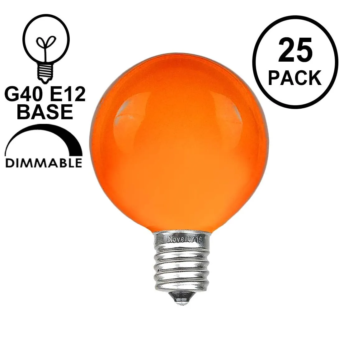 Our Orange satin G40 replacement bulbs are perfect for all occasions. G40 bulbs are ideal for weddings, tents, patios, awnings and all Holiday decor. These durable round 5-watt, 130-volt bulbs will illuminate any setting for 3000 hours. Our Orange G40 replacement bulbs can be used with our C7 Commercial grade Stringers, Heavy Duty Candelabra (e12) Stringers, C7 1000′, 500’ and 250’ Bulk Spools or Vintage e12 Twisted Wire Strings with Bakelite Sockets . Our G40 Orange satin bulbs are sold in packs of 25. You will qualify for a quantity discount when buying at least 20 packs of 25 bulbs.