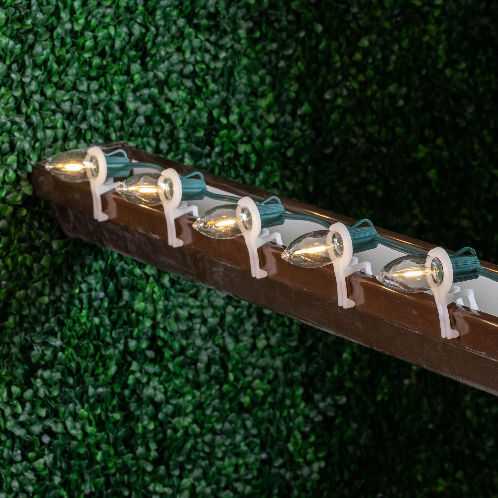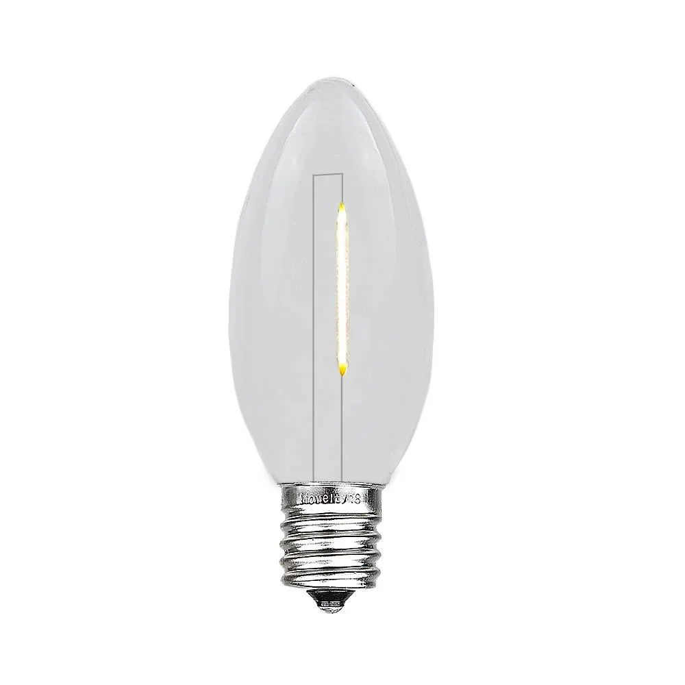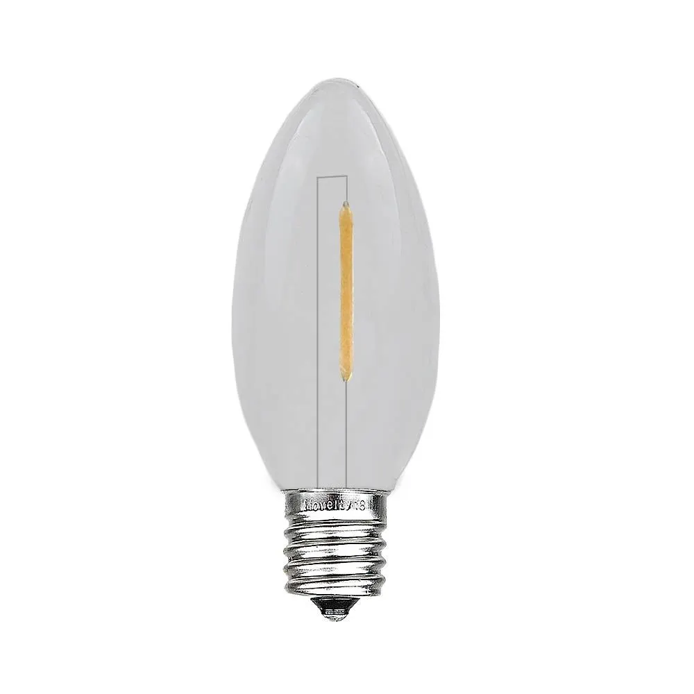 Novelty Lights Warm White C9 LED Plastic Filament Retrofit replacement lamps, utilize a 1 LED filament design for veiwing from all angles. Switch out those old incandescent C9 bulbs that consume too much energy and break all time for our energy efficient Retro-fit C9’s utilizing LED filament technology. Our bulbs are made of a quality plastic providing a durable LED C9 that will not chip, fade or crack. These Warm White C9’s are also dimmable making them perfect for animated displays. All of our LED C9’s are energy efficient using only 0.06 Watts and 0.005 Amps. Built to last with a 2 season warranty. Our C9 plastic filament LED bulbs will provide years of quality use. Perfect for seasoned Christmas light installers, yet easy for anyone to decorate roof lines, trees, buildings, walkways and porches. Our LED C9 plastic filament LED bulbs can be used with our C9 stringers (100′, 25′, 12.5′ & 10′), as well as our commercial grade C9 Bulk Spools and our Vintage Twisted Wire Strings with E17 Bakelite Sockets.